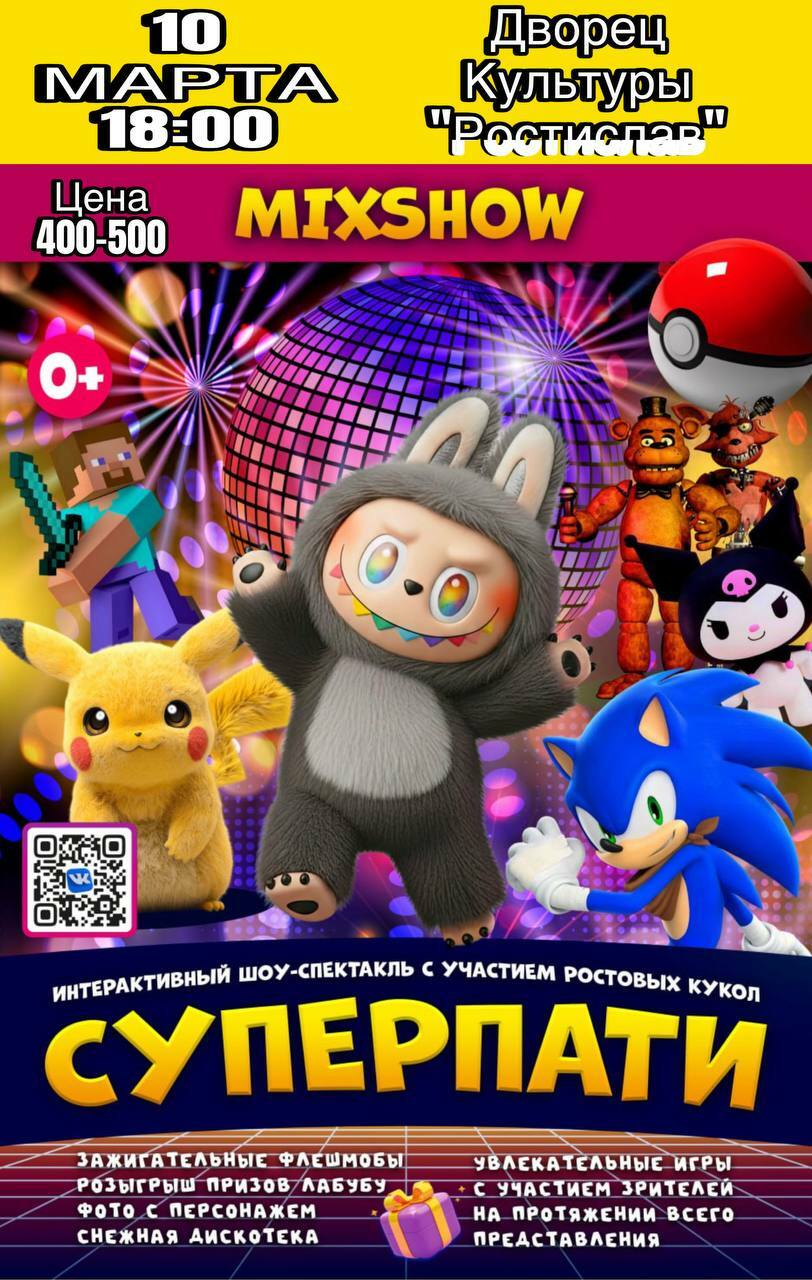 Театр «MixShow” Приглашает вас на интерактивный, поучительный шоу-спектакль🎪 с участием ростовых кукол!!! Получите массу положительных эмоций от игры с нашими персонажами🤩 Вас ждут🤩➡️ Радужный Лабубу, Мишка Фредди🐻, Лис Фокси🦊, Пикачу🐱, очаровательная Куроми🌹, Майнкрафт и другие! Так же вас ждёт лазерная анимация, игры сгигантскими покеболы☄️, ❄️снежная дискотека❄️ и многое другое!Розыгрыш призов🎁, фото с любимым персонажем 📸 ,Флешмоб с участием зрителей и любимых героев, интерактив с залом на протяжении всего представления👯 💫…В продаже: сладкая вата 💭,карамельный попкорн 🍿 сувениры…