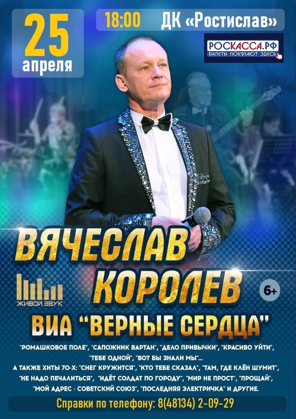 Основатель и солист ВИА «Верные сердца» Вячеслав Королев вместе с музыкантами представят в своей программе не только отборные хиты 70-х, но и лучшие новые песни, написанные как в жанре ВИА, так и в стиле современной эстрады, которым публика кричала «Браво!» на многочисленных концертах коллектива: «Ромашковое поле», «Тебе одной», «Дело привычки», «Красиво уйти», «Вот бы знали мы», «Танцуй со мной» …