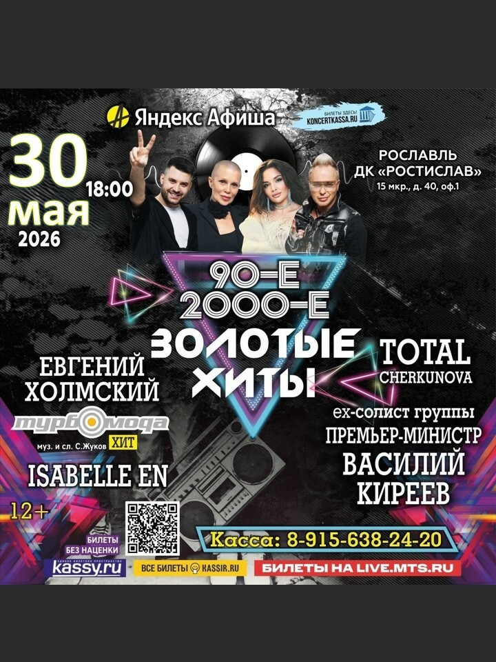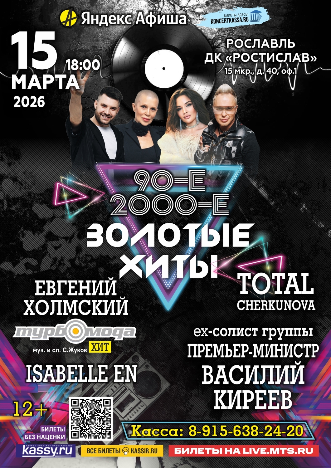Концерт «ЗОЛОТЫЕ ХИТЫ». Легендарные группы 90-х и 2000-х 15 марта 2026 г. Начало: 18:00 г. Рославль, ДК «Ростислав» Продолжительность 2 часа.