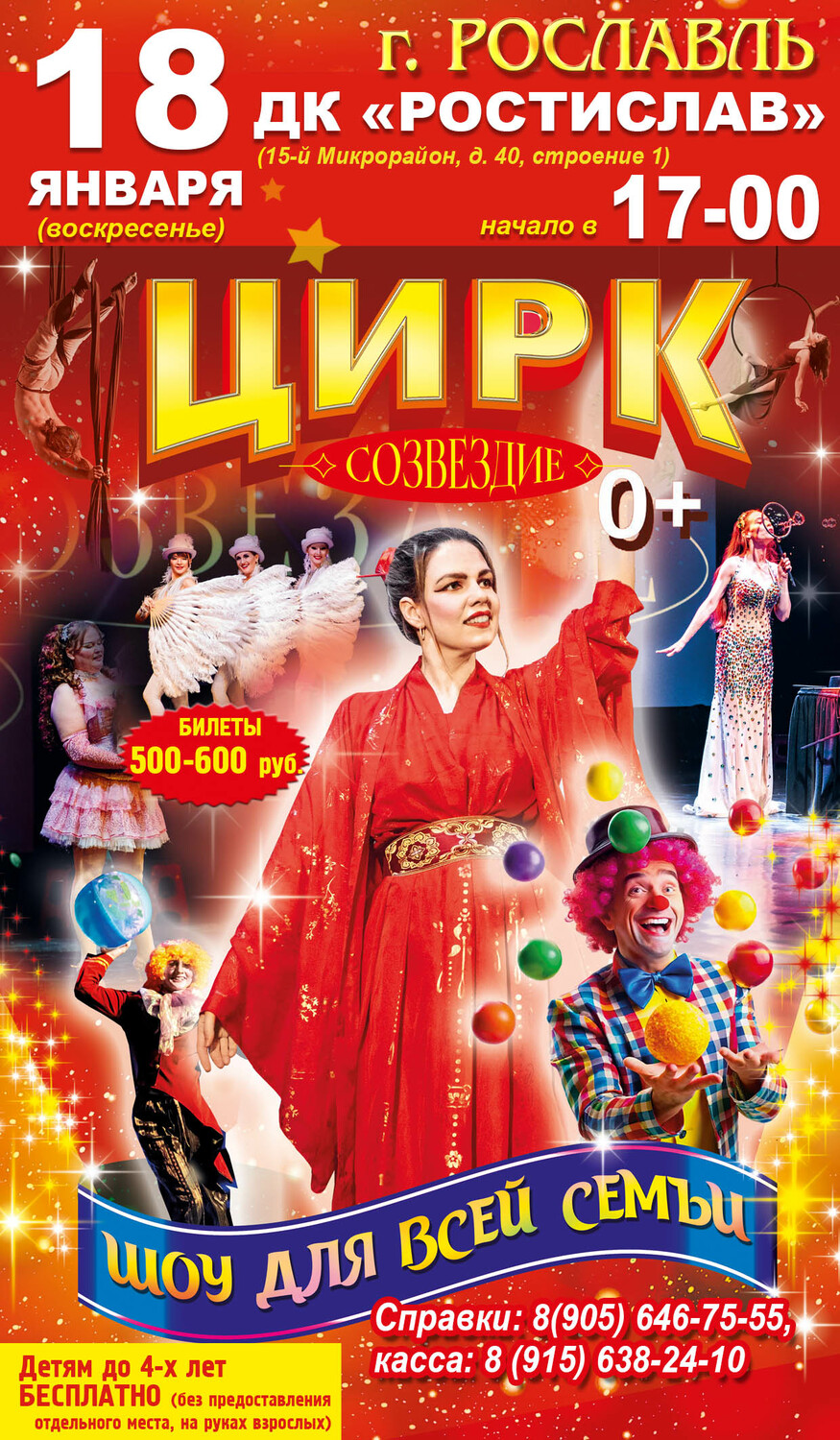 Рославль, встречайте! 18 января (воскресенье) в 17:00 на сцене ДК "РОСТИСЛАВ" (15-й Микрорайон, д. 40, строение 1) ТЕАТРАЛЬНО-ЦИРКОВОЕ ШОУ "СОЗВЕЗДИЕ" (г. Брянск). Только одно представление! Стоимость билетов: 500/600₽ (в зависимости от выбранного Вами места в зале), детям до 4-х лет - бесплатно! Касса:+7(915) 638-24-10.