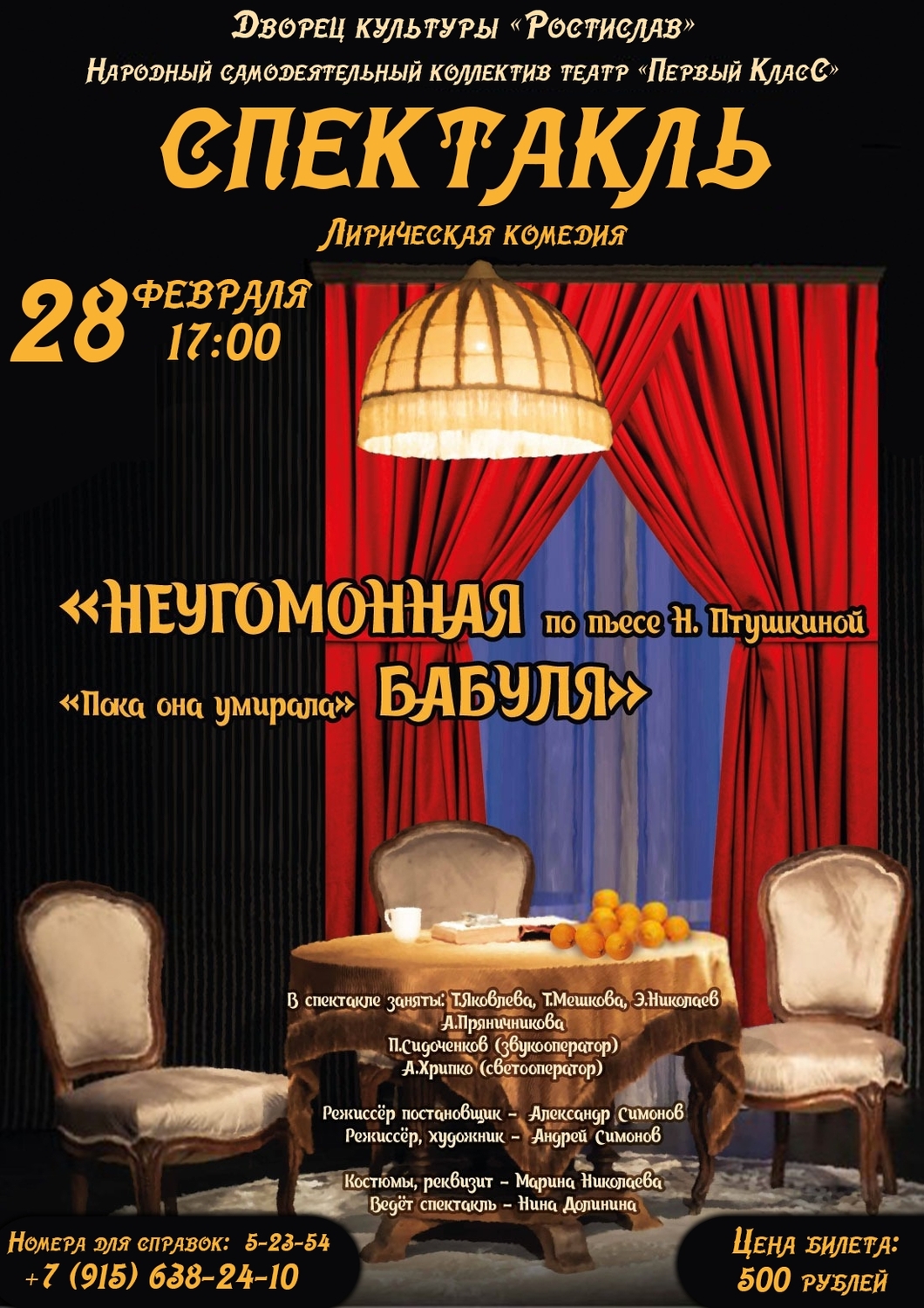 Приглашаем всех любителей театра 28 февраля в 17:00 в МБУК "ДК "Ростислав" 🏛 на спектакль «Неугомонная бабуля» народного самодеятельного коллектива театра «Первый КласС» (МБУ КЦ «Юбилейный», г. Рославль, руководитель Александр Симонов)🎭